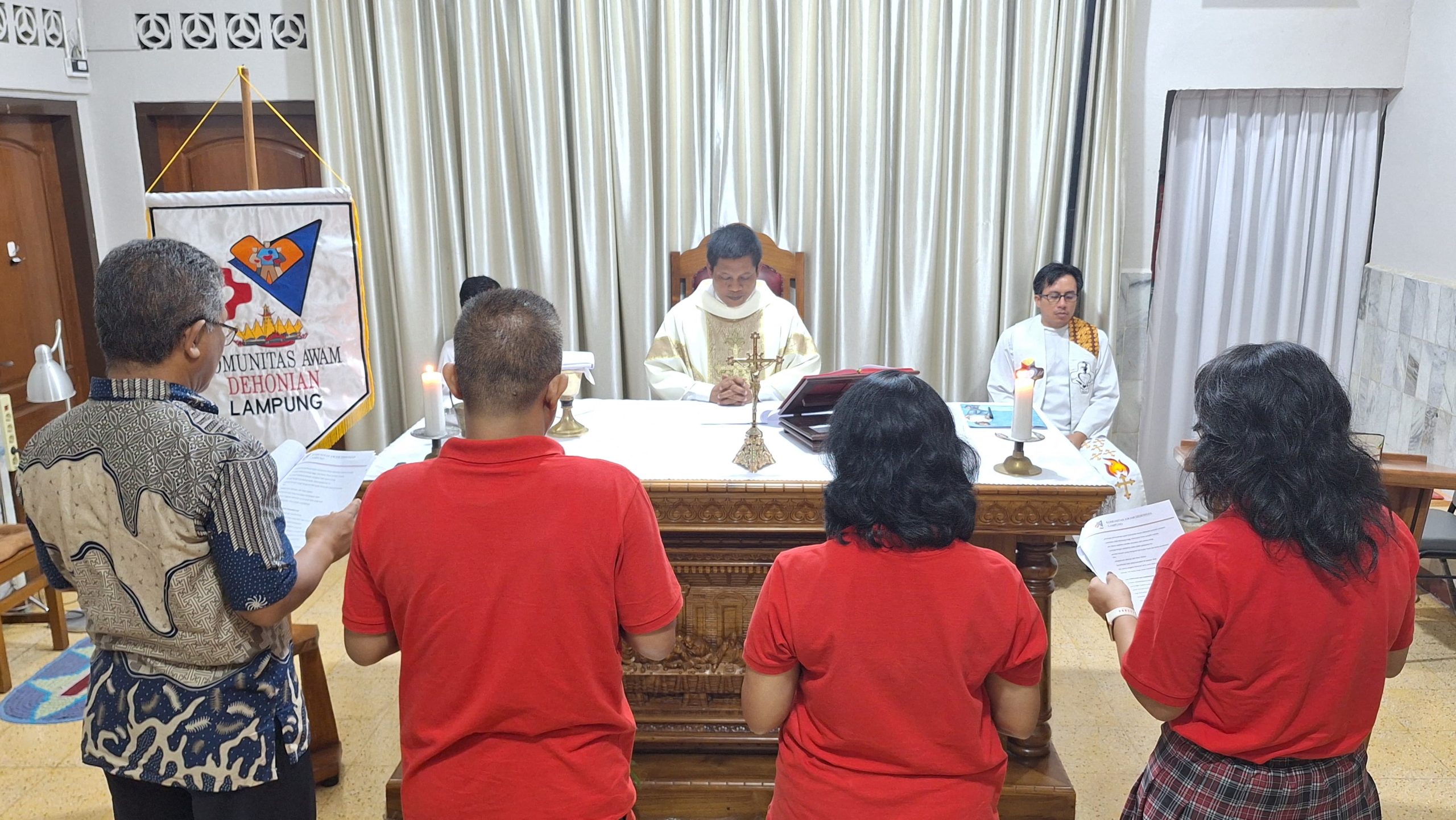 Pada pukul 12.30, kegiatan dilanjutkan dengan makan siang dan persiapan Perayaan Ekaristi pengukuhan pengurus. Perayaan Ekaristi pengukuhan pengurus dipimpin oleh Rm. Riyanto SCJ, Rm. Sukamto SCJ dan Rm V. Anggoro Ratri SCJ, bertempat di kapel biara Superiorat SCJ. Bertepatan dengan Hari Raya Tahta Santo Petrus, Rm. Riyanto membantu refleksi. Tahta Santo Petrus bukanlah tahta kekuasan namun tahta tanggung jawab dalam mengembalakan domba. Bukan tahta yang bergelimang kekayaan tapi justru pengorbanan, bukan juga tahta kebanggaan tapi tahta yang mengharuskan kerendahan hati. Pada bacaan pertama, Surat Pertama Rasul Petrus tertulis “Gembalakanlah kawanan domba Allah yang ada padamu.” Kutipan ini merupakan dasar untuk menjadi pengurus komunitas bahwa menjadi pengurus jangan dengan terpaksa, tetapi dengan sukarela sesuai kehendak Allah. Pengurus jangan mau mencari keuntungan, tetapi dengan pengabdian diri.